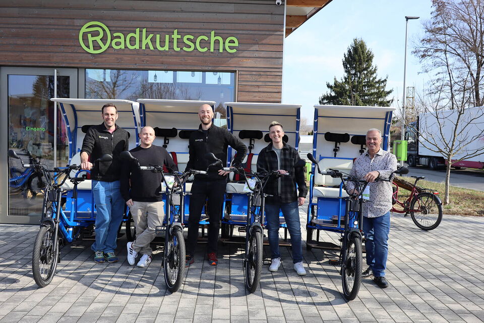 Foto: Die blauen Rikschas mit ihren weißen Dächern lassen sofort Urlaubsfeeling aufkommen. Die Radkutsche in Nehren, die die Räder für die KBF gefertigt hat, hat bei der Umsetzung des Projektes an jedes Detail gedacht, so dass Menschen mit Behinderung künftig tolle Ausflüge unternehmen können. Auf dem Bild sind zu sehen Kathrin Strobel von der Kita Blumenwiese in Hechingen, Andreas Marx, Koordinator der Wohnhäuser Hechingen und Balingen sowie Wolfgang Leins, Koordinator des Wohnhäuser in Mössingen mit Vertriebsleiter Rick Creemers von der Radkutsche und Geschäftsführer Stefan Rickmeyer